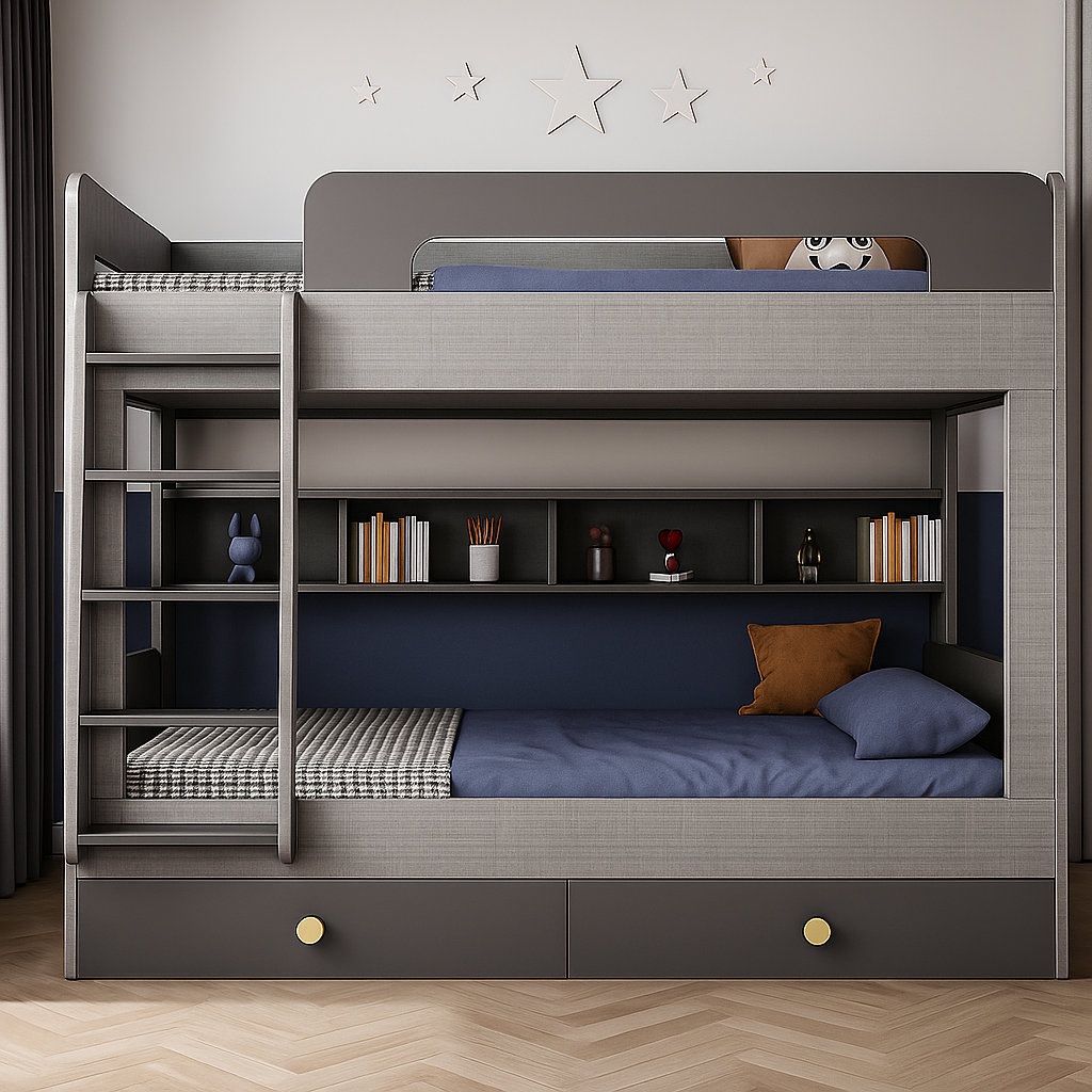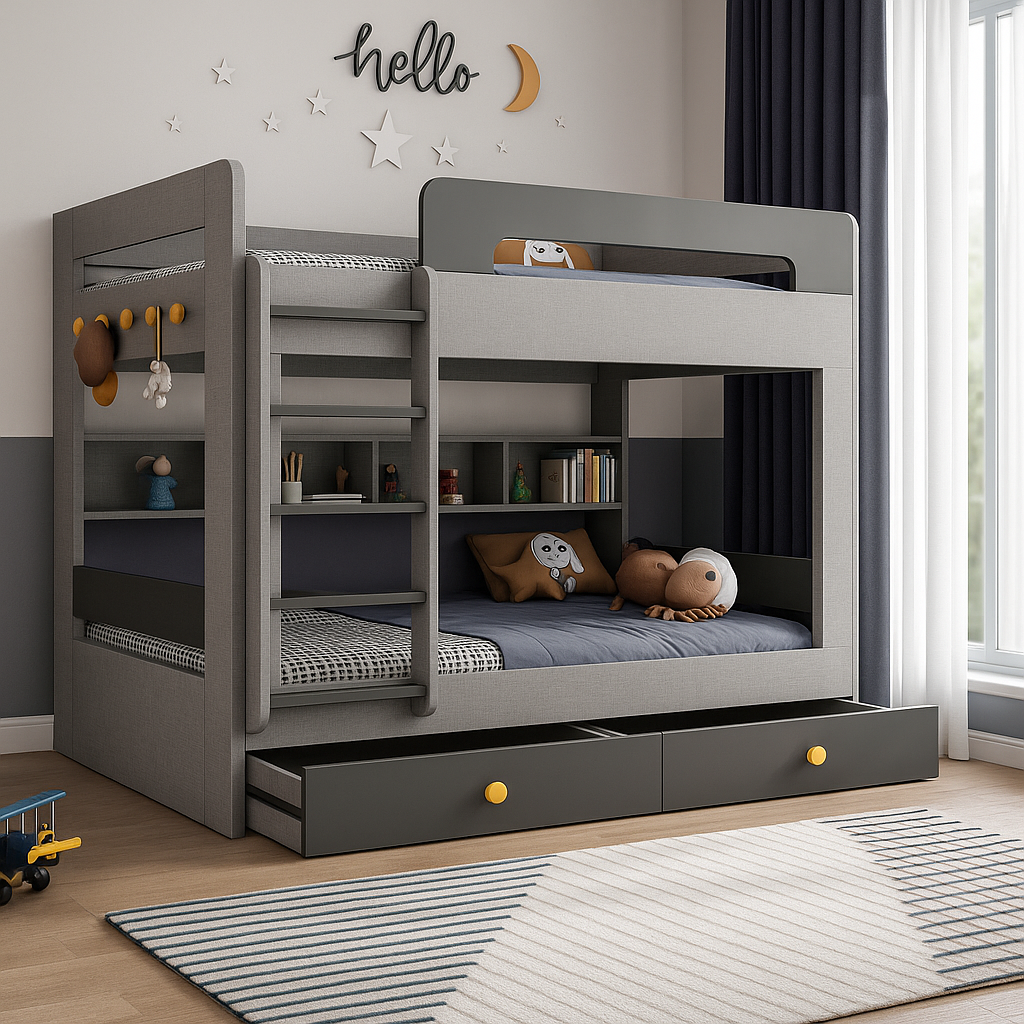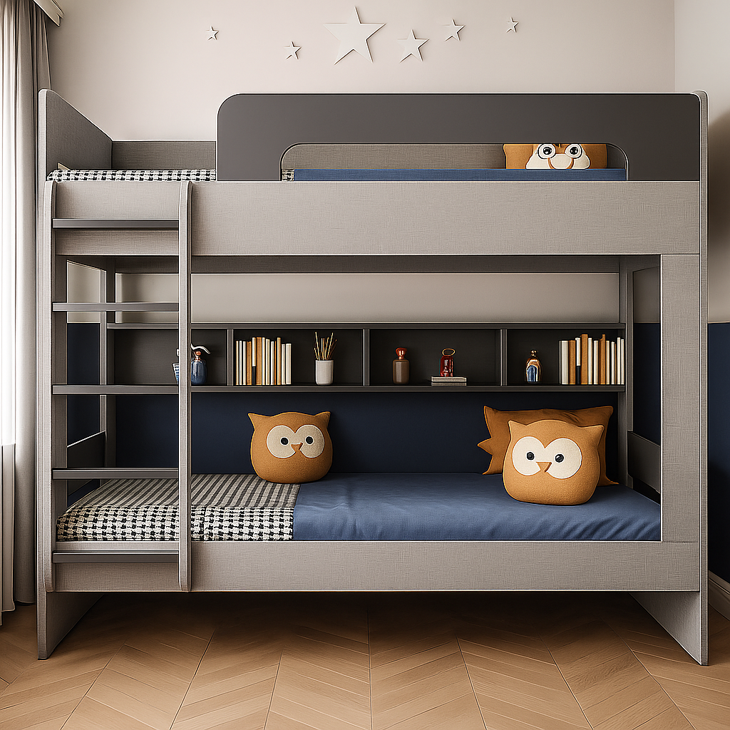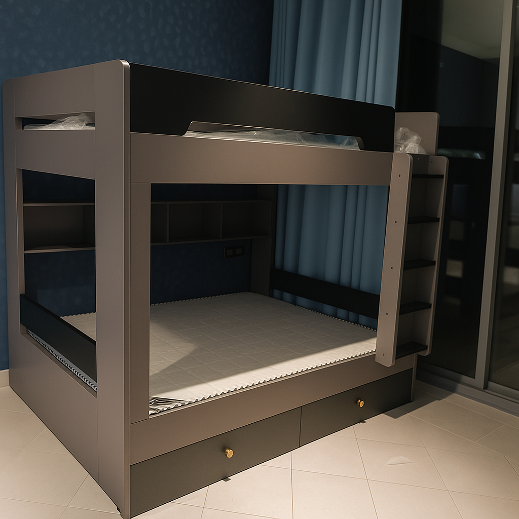 2. Стандарт: ДСП 18 мм, кромка 2 і 1 мм, телескопічні напрямні, класичні петлі, є декоративні вирізи, округлення в столах, поличках, бортах, сходах. Меблі виглядають як на фото і є більш цікавими і комфортними. Ящики закриваються тихіше і плавніше. Використовується високоякісна фурнітура ТМ Muller , яка має гарантію 10 років. Рекомендоване навантаження на спальне місце до 120 кг.