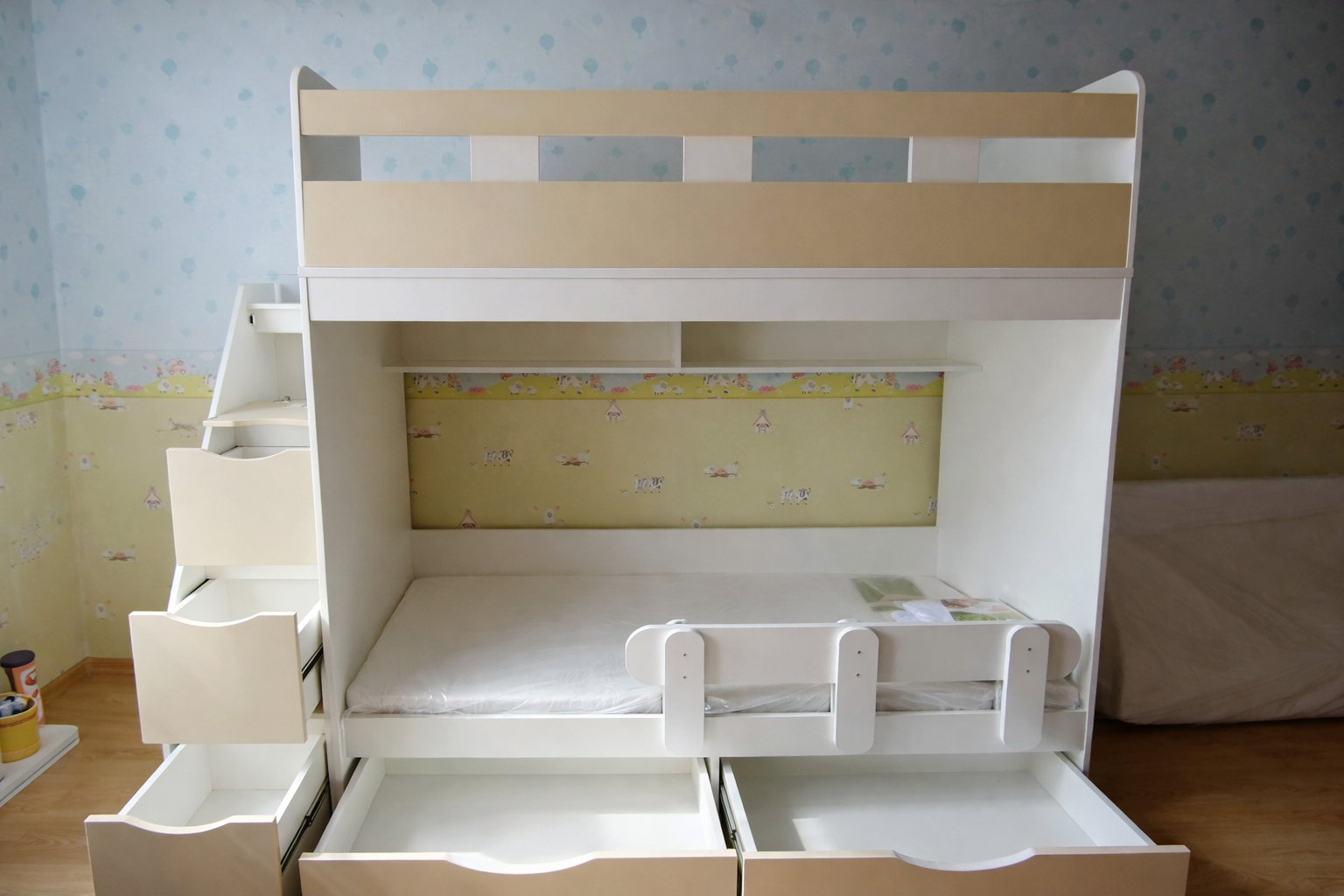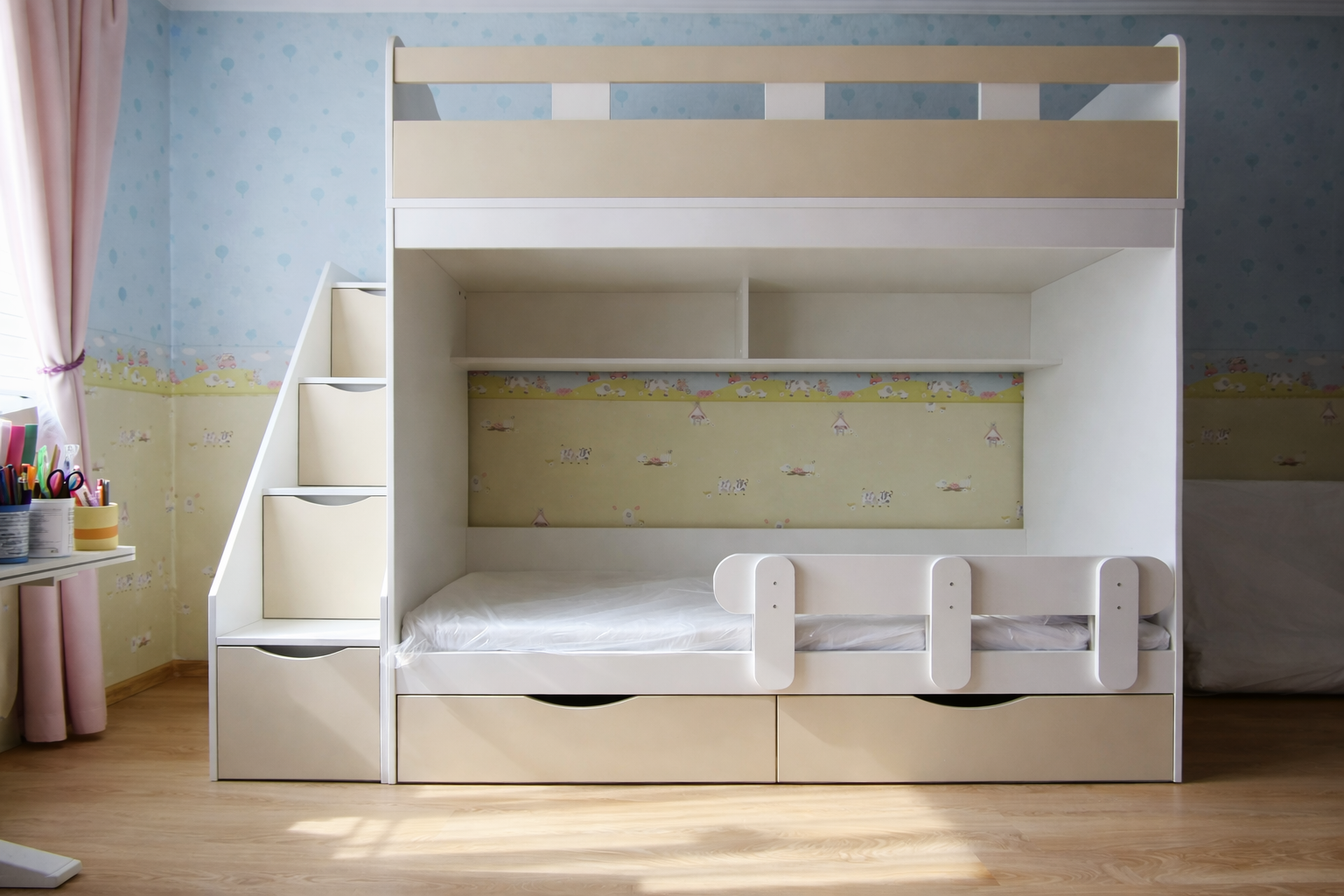 2. Стандарт: ДСП 18 мм, кромка 2 і 1 мм, телескопічні напрямні, класичні петлі, є декоративні вирізи, округлення в столах, поличках, бортах, сходах. Меблі виглядають як на фото і є більш цікавими і комфортними. Ящики закриваються тихіше і плавніше. Використовується високоякісна фурнітура ТМ Muller , яка має гарантію 10 років. Рекомендоване навантаження на спальне місце до 120 кг.
