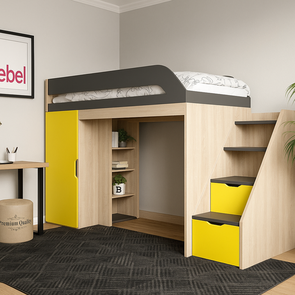 2. Стандарт: ДСП 18 мм, кромка 2 і 1 мм, телескопічні напрямні, класичні петлі, є декоративні вирізи, округлення в столах, поличках, бортах, сходах. Меблі виглядають як на фото і є більш цікавими і комфортними. Ящики закриваються тихіше і плавніше. Використовується високоякісна фурнітура ТМ Muller , яка має гарантію 10 років. Рекомендоване навантаження на спальне місце до 120 кг.