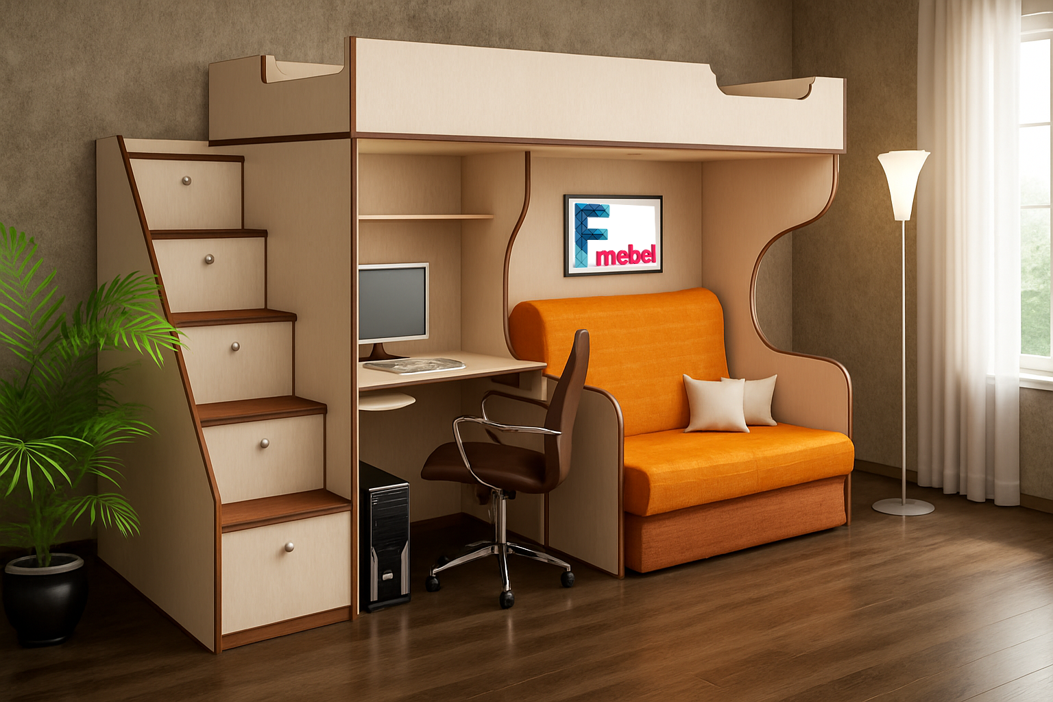 2. Стандарт: ДСП 18 мм, кромка 2 і 1 мм, телескопічні напрямні, класичні петлі, є декоративні вирізи, округлення в столах, поличках, бортах, сходах. Меблі виглядають як на фото і є більш цікавими і комфортними. Ящики закриваються тихіше і плавніше. Використовується високоякісна фурнітура ТМ Muller , яка має гарантію 10 років. Рекомендоване навантаження на спальне місце до 120 кг.