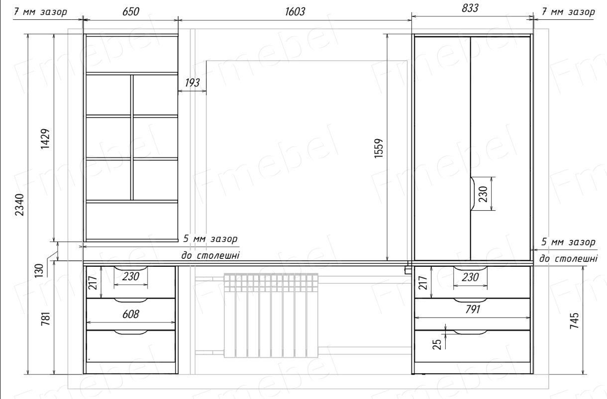 Ціна вказана за 1 м.п. у вартість входять входять лише меблі. У місці розміщення телевізора ми рекомендуємо розміщувати стінову панель, щоб за нею приховати всі дроти. Стінова панель прораховується окремо. Варіанти стінових панелей та ціни можна подивитися тут. Також у кришці тумби ми за вашим бажанням додаємо виріз під дроти, а в задній стінці робимо доступ до розеток (приклад на відео внизу опису). Висота та ширина - індивідуально за розмірами клієнта. Глибина навісних модулів не більше 350 мм. Навісні тумби розміщуються на висоті від підлоги до низу тумби – 300мм. Але також можливе індивідуальне розміщення за бажанням покупця.