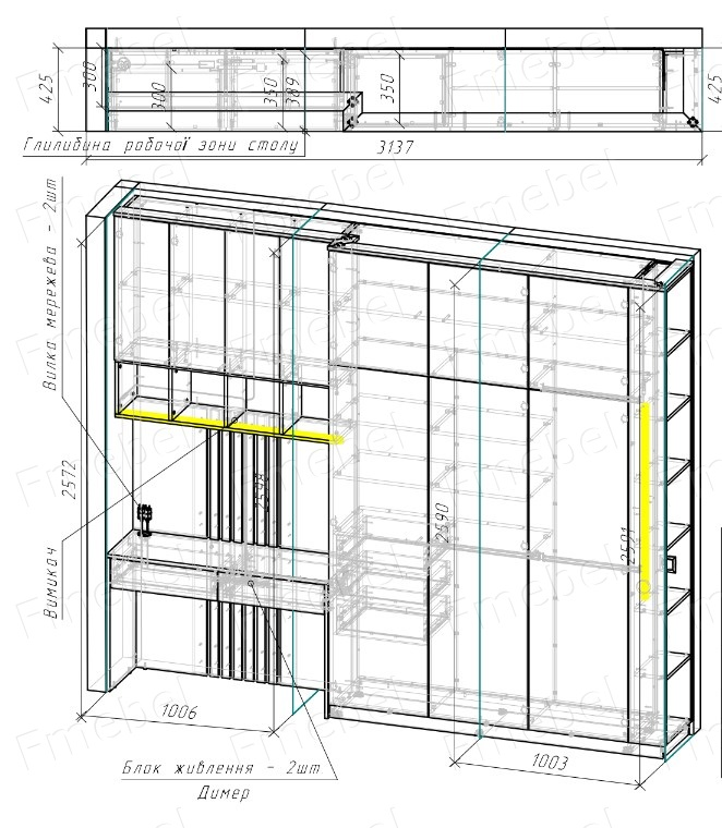 Ціна вказана за 1 м.п. у вартість входять входять лише меблі. У місці розміщення телевізора ми рекомендуємо розміщувати стінову панель, щоб за нею приховати всі дроти. Стінова панель прораховується окремо. Варіанти стінових панелей та ціни можна подивитися тут. Також у кришці тумби ми за вашим бажанням додаємо виріз під дроти, а в задній стінці робимо доступ до розеток (приклад на відео внизу опису). Висота та ширина - індивідуально за розмірами клієнта. Глибина навісних модулів не більше 350 мм. Навісні тумби розміщуються на висоті від підлоги до низу тумби – 300мм. Але також можливе індивідуальне розміщення за бажанням покупця.